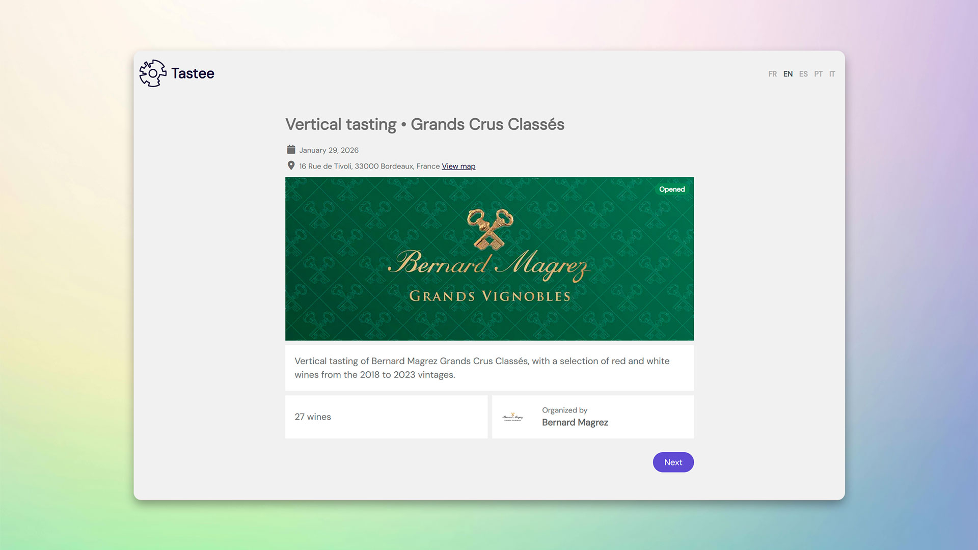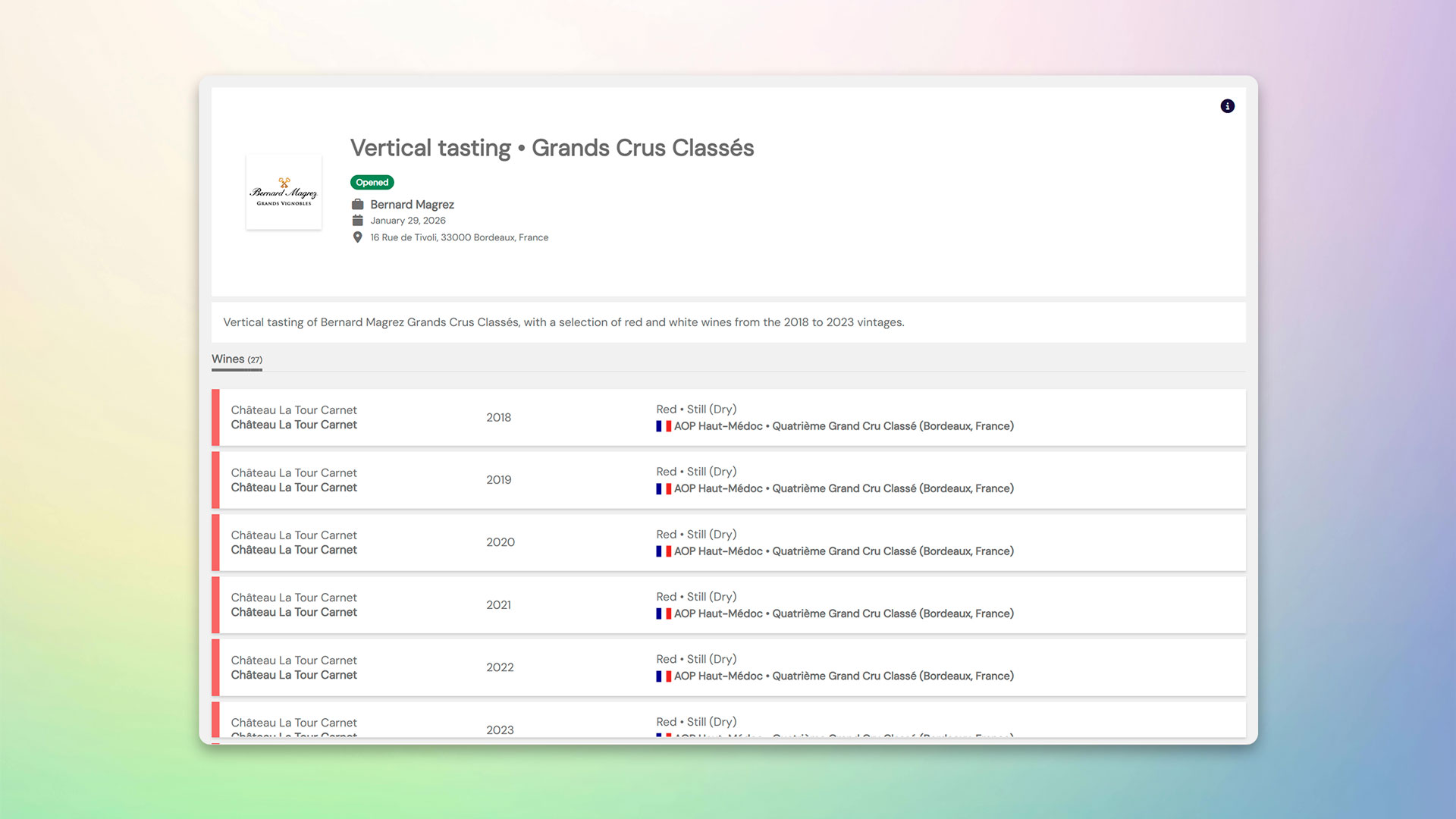 Une dégustation verticale est un moment privilégié où l'on parcourt l'histoire d'un domaine à travers ses millésimes, pour comprendre la signature du vigneron et faire un benchmark des vins de la propriété. C'est ce qu'a fait Bernard Magrez le 29 janvier dernier, avec une dégustation des millésimes 2018 à 2023 de ses 4 Grands Crus Classés présentés à des négociants et courtiers bordelais. Pour l’occasion Bernard Magrez à confié à Tastee la digitalisation de cet événement.